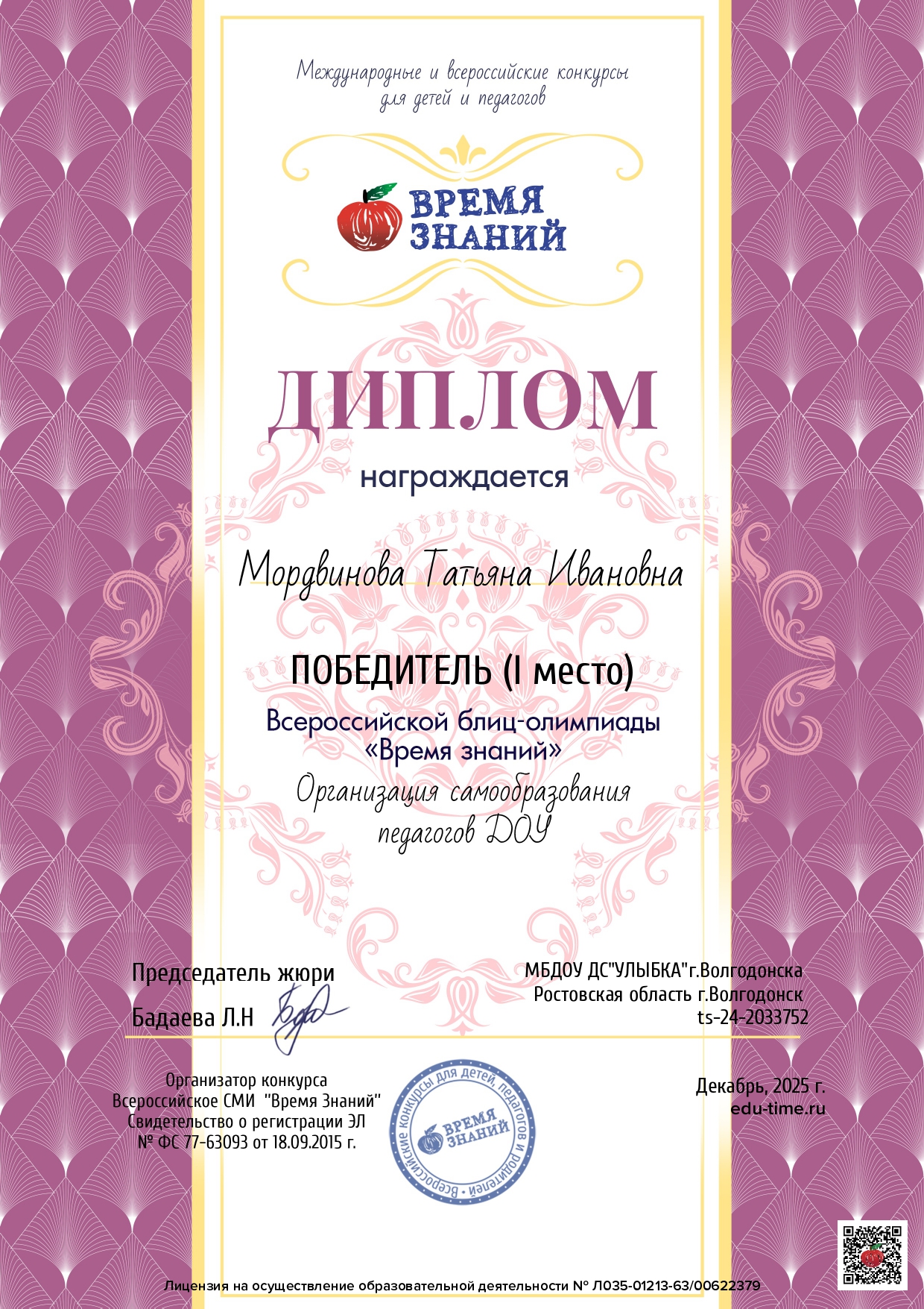 приняла участие во Всероссийском СМИ «Время знаний», во Всероссийской блиц – олимпиаде « Особенности учебной мотивации детей старшего дошкольного возраста» 20.01.2025