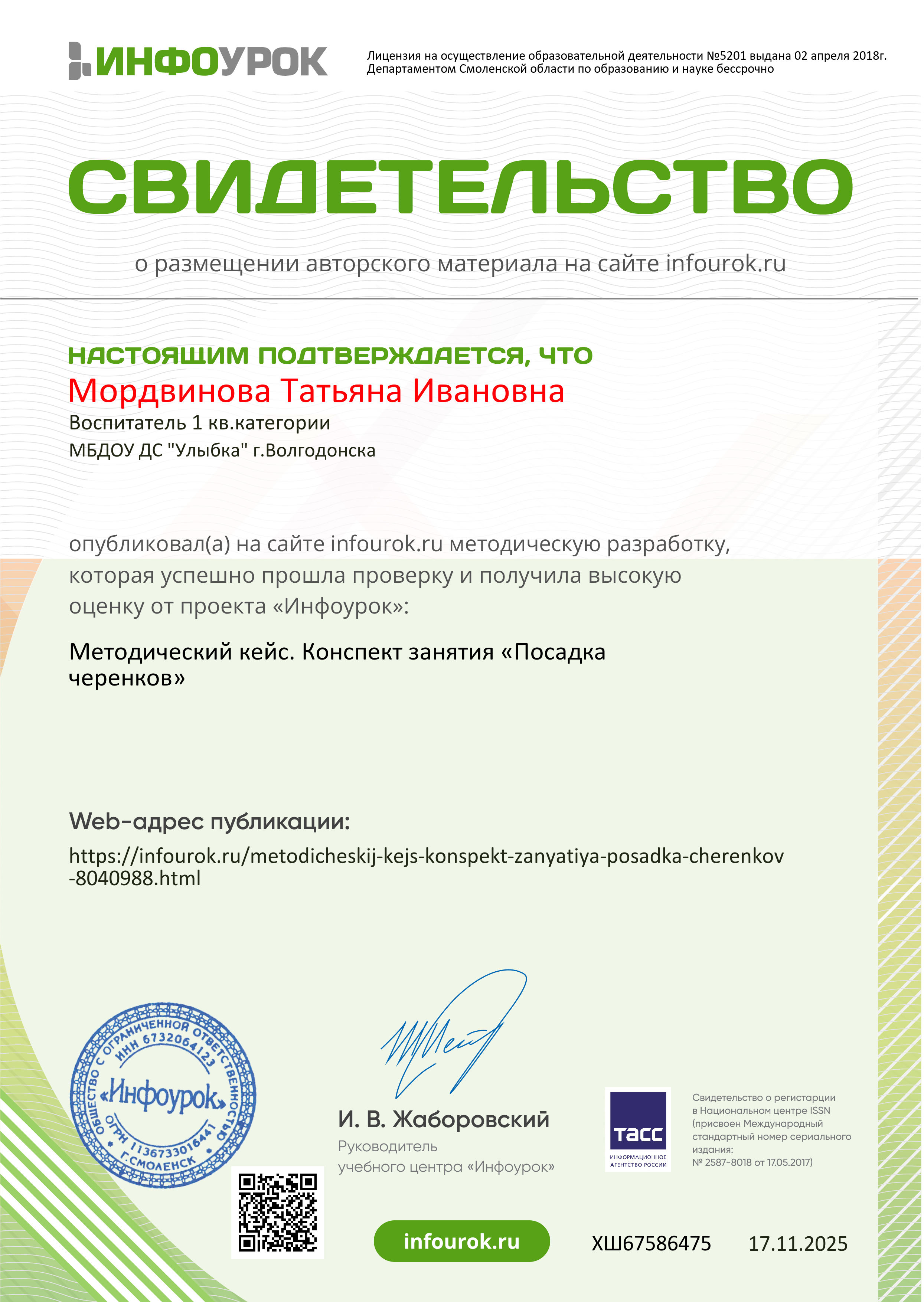 приняла участие во Всероссийском СМИ «Время знаний», во Всероссийской блиц – олимпиаде «Развитие у дошкольников ценностного отношения к природе» 21.11.2024