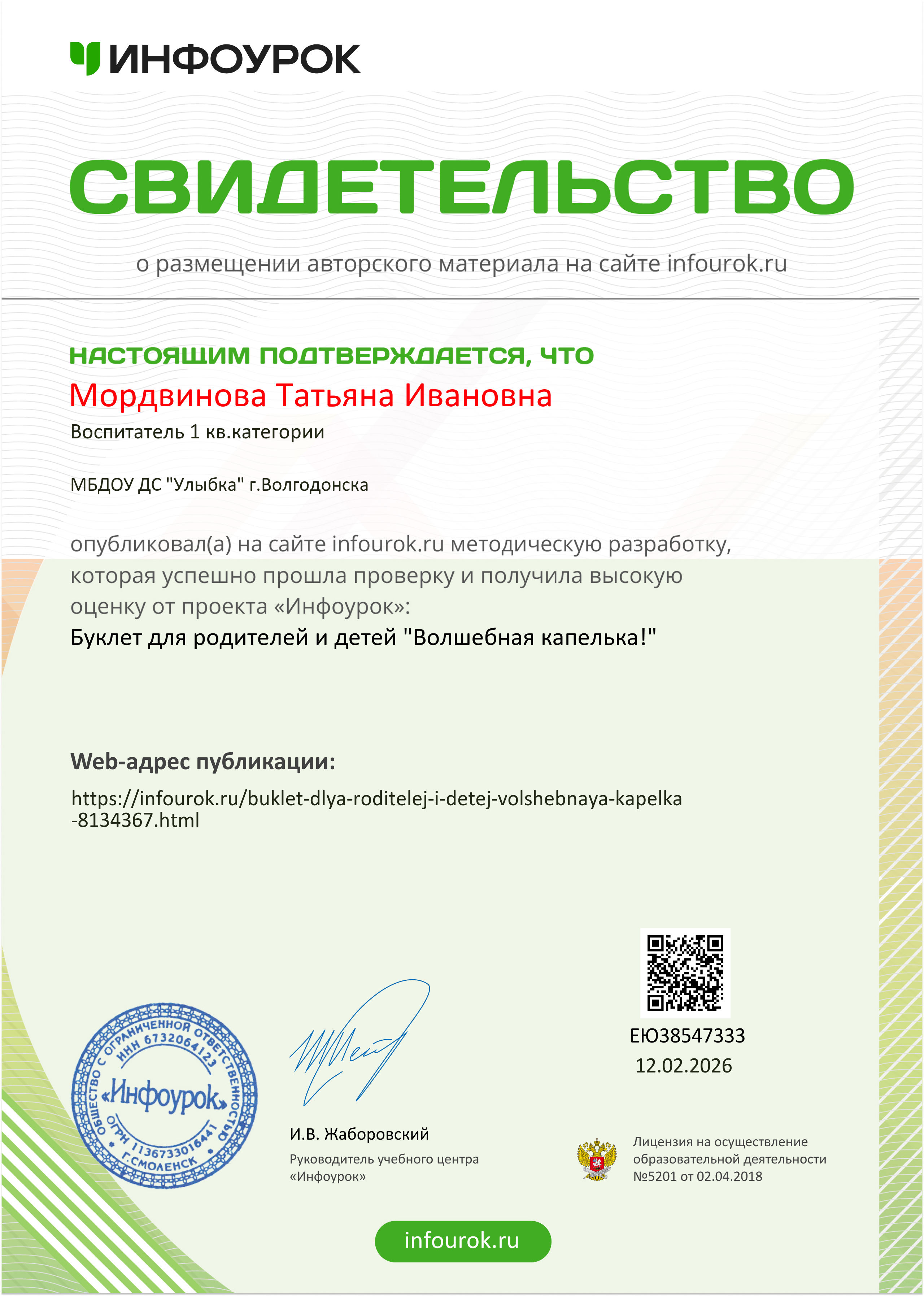 на образовательном портале Инфоурок была опубликована методическая разработка: Памятка для родителей «Волшебная капелька»