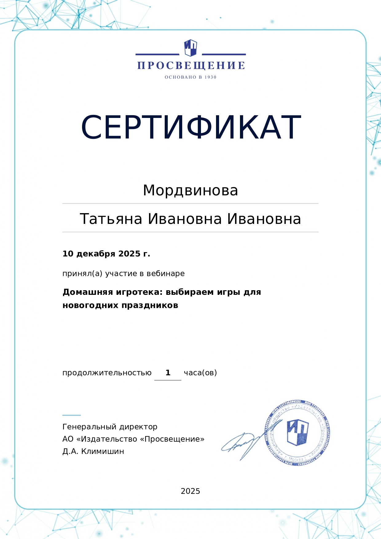приняла участие в вебинаре АО «Просвещение»: «Домашняя игротека: выбираем игры для новогодних праздников»