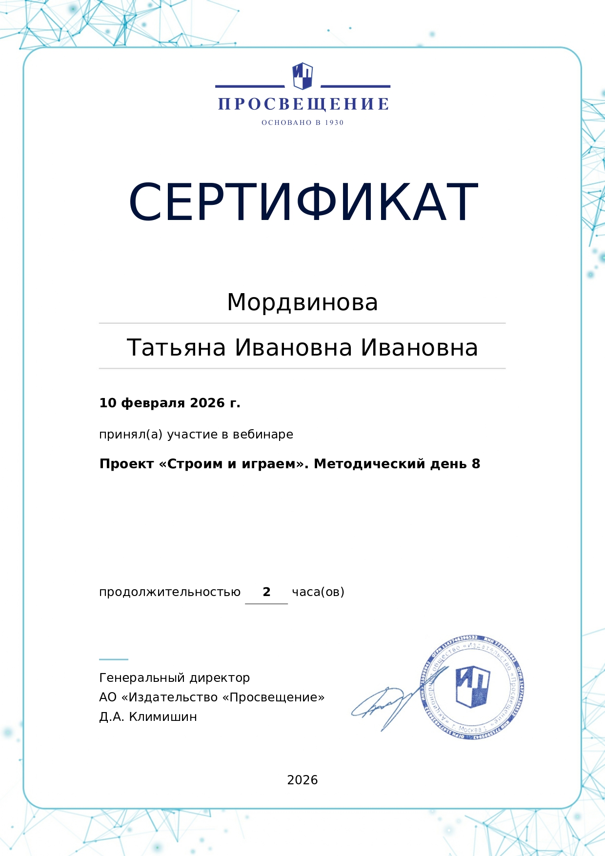участие в вебинаре АО «Просвещение»: «Проект «Строим и играем». Методический день 8»